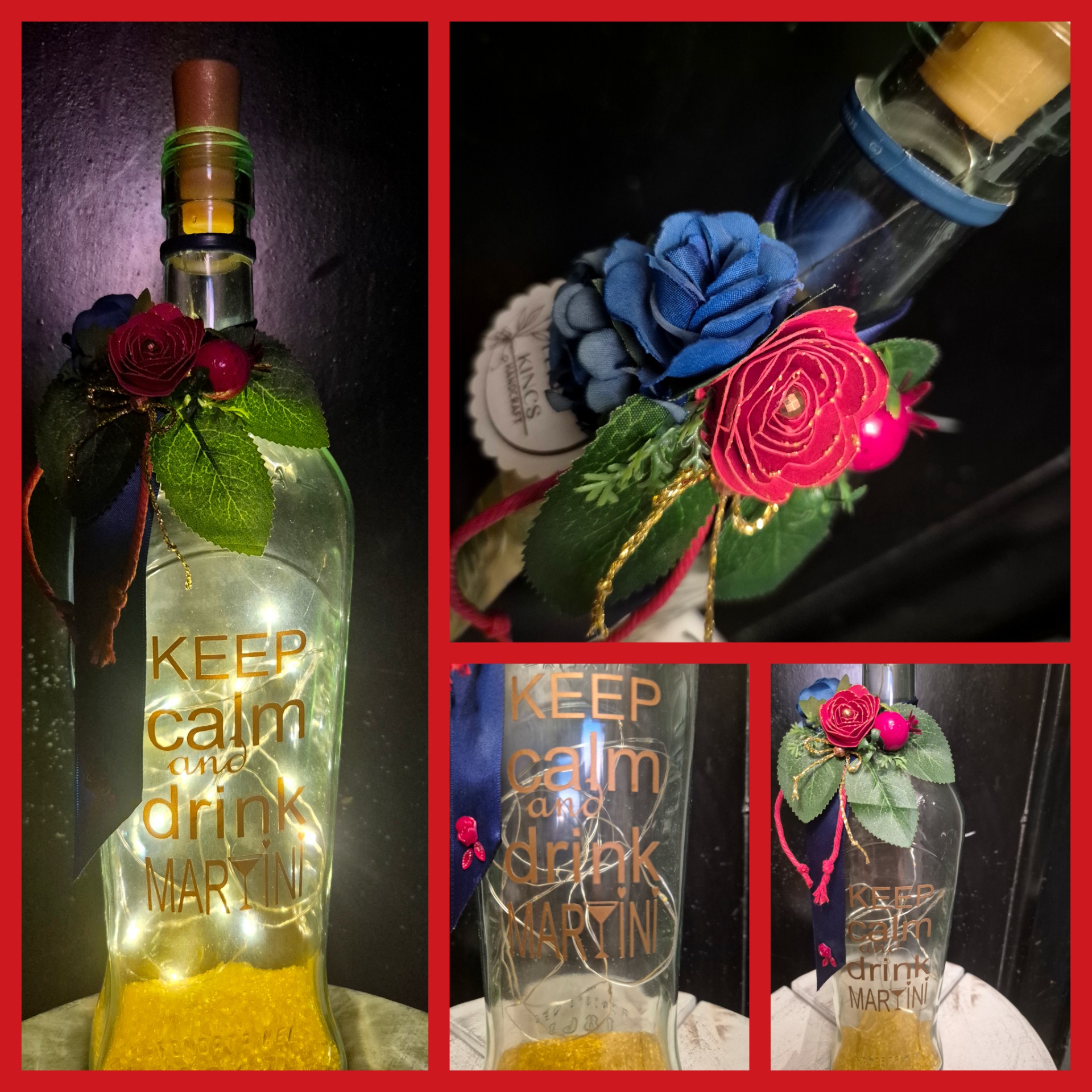 Meghitt dekoráció fénnyel. Tökéletes ajándék Martini-kedvelőknek, vagy bármely tér egyedi kiegészítője lehet. A papír rózsa kézzel készült. Töltet: aranyló dekorkristály. A ledfüzért elemmel biztosítom. A felirat saját design.