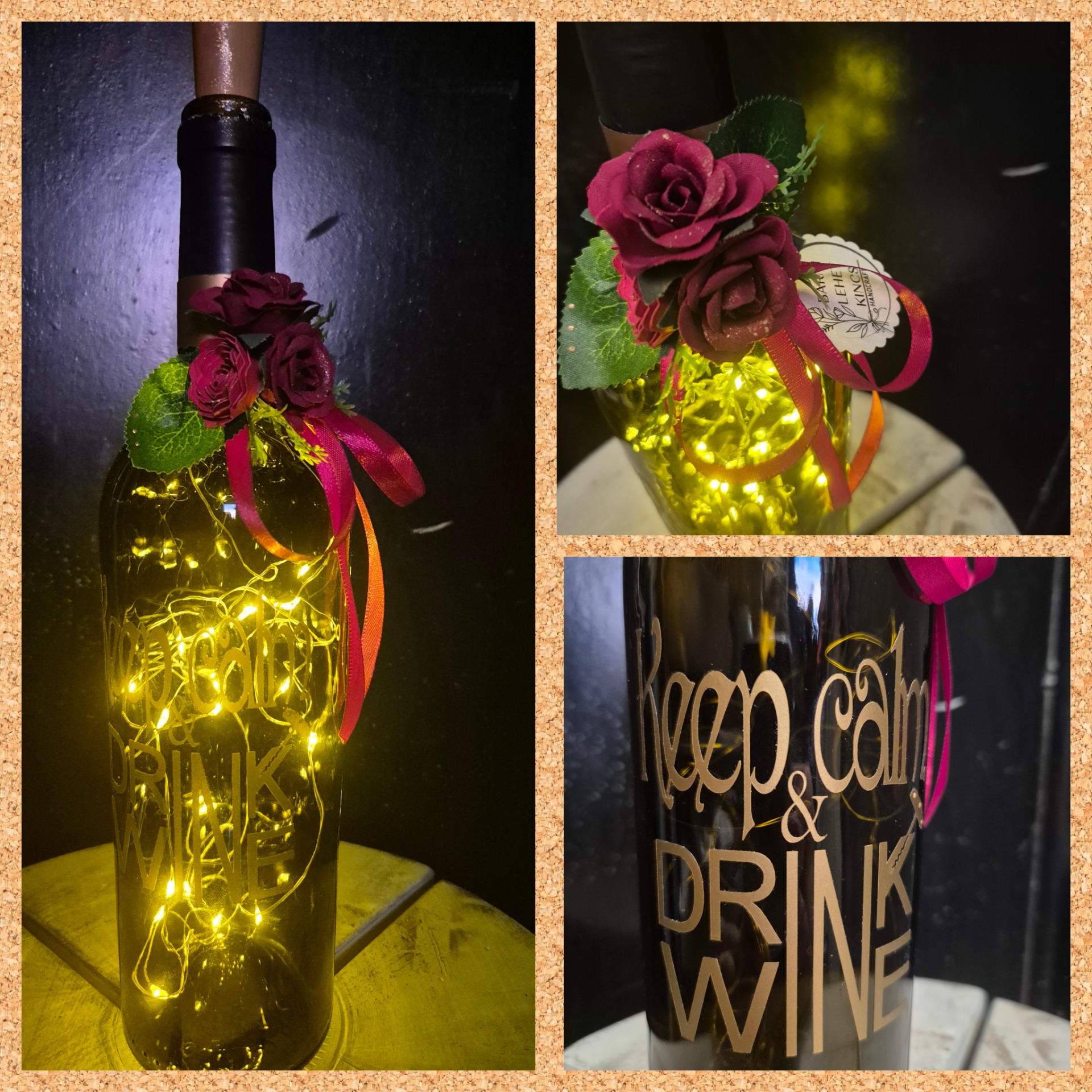 Meghitt dekoráció fénnyel. Tökletes ajándék borkedvelőknek, vagy bármely tér egyedi kiegészítője lehet. A ledfüzért elemmel biztosítom. A felirat saját design.