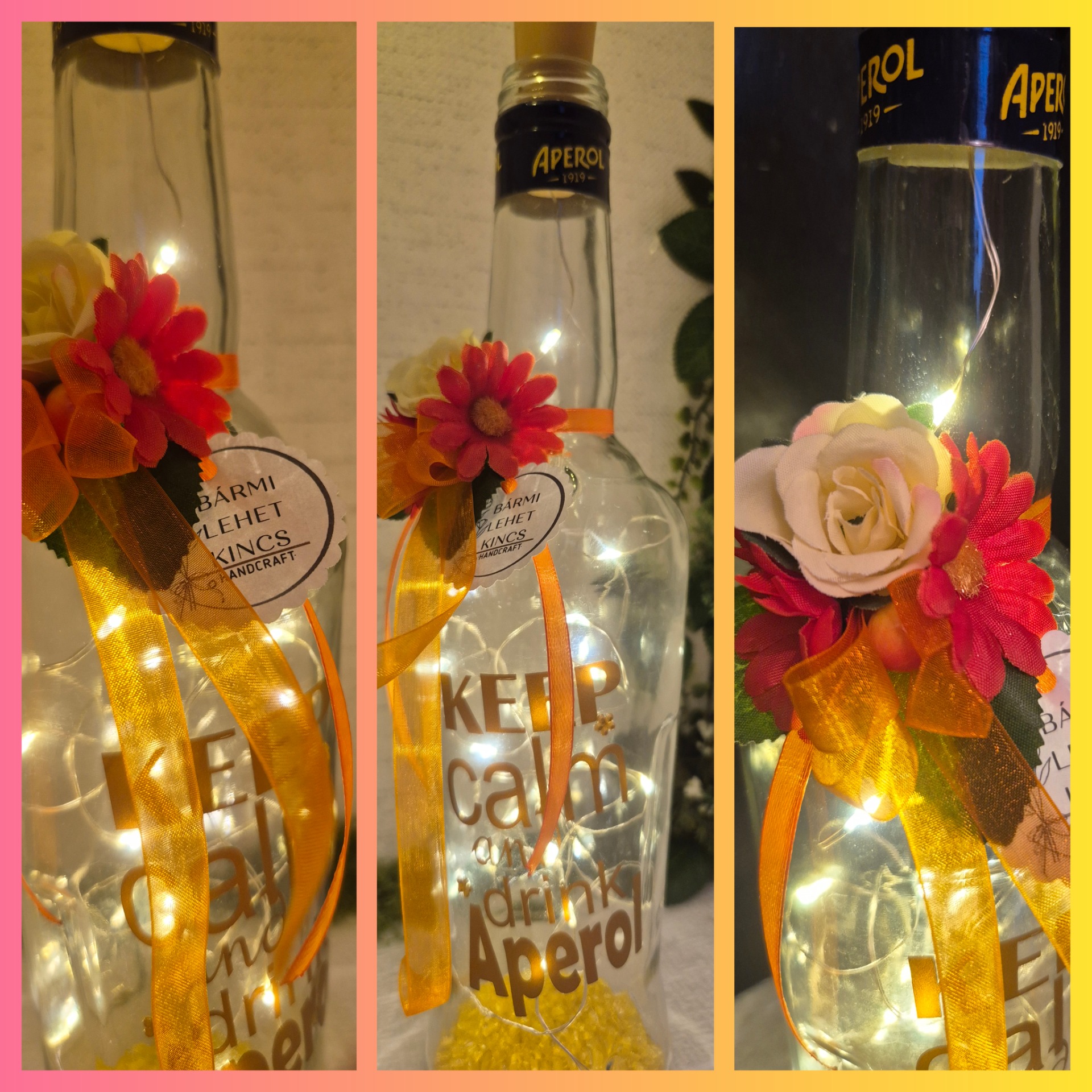 Szereted az Aperolt? Eszedbe jut róla egy személy, egy helyszín? 🧡 Meghitt dekoráció fénnyel. Tökéletes ajándék az Aperol szerelmeseinek, vagy bármely tér egyedi kiegészítője lehet. Töltet: aranyló dekorkristály. A ledfüzért elemmel biztosítom. A felirat saját design.