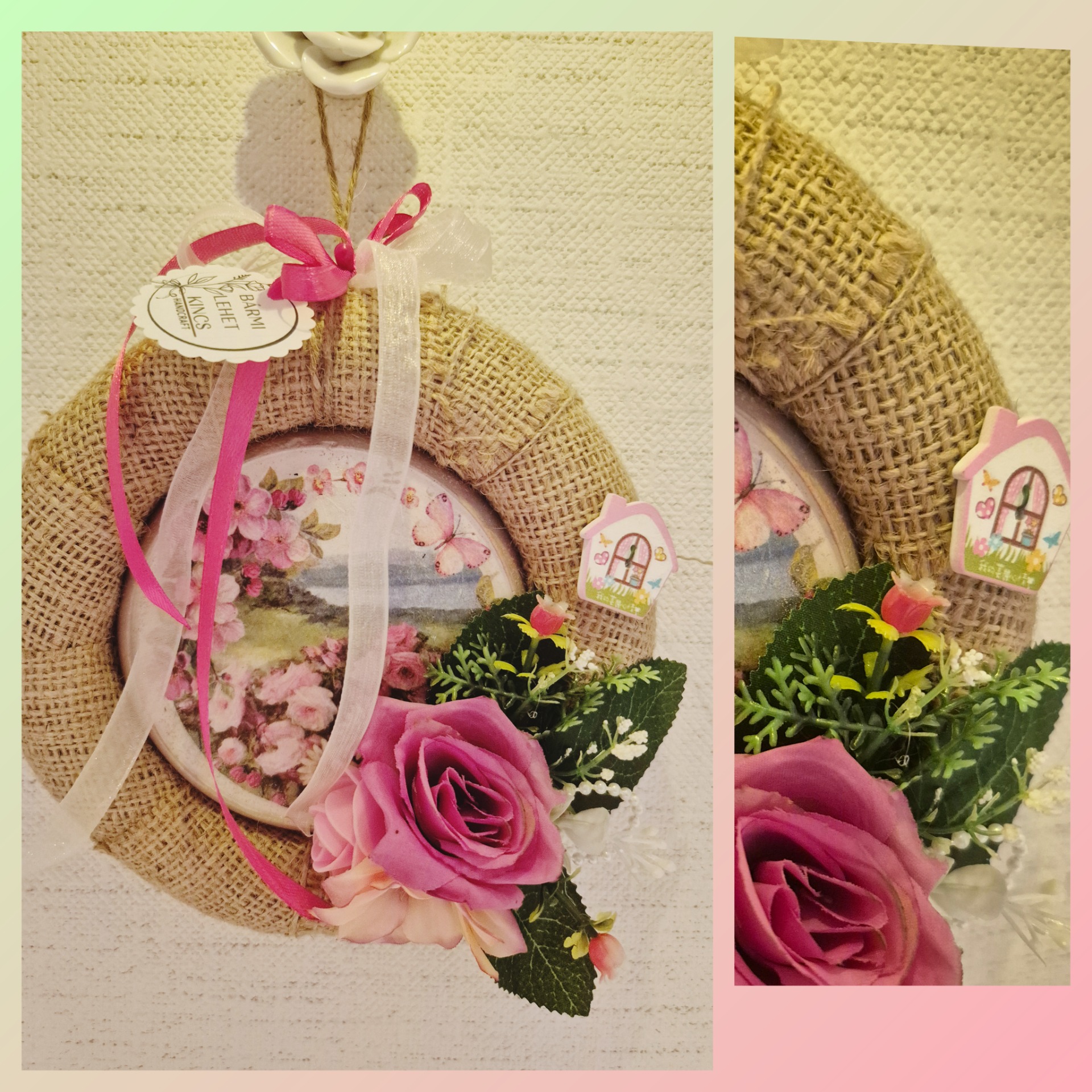 Romantikus, rózsaszínes pillangós középpel és virágkompozícióval díszített függő koszorú mely tavaszi hangulatot idéz bármely térben.