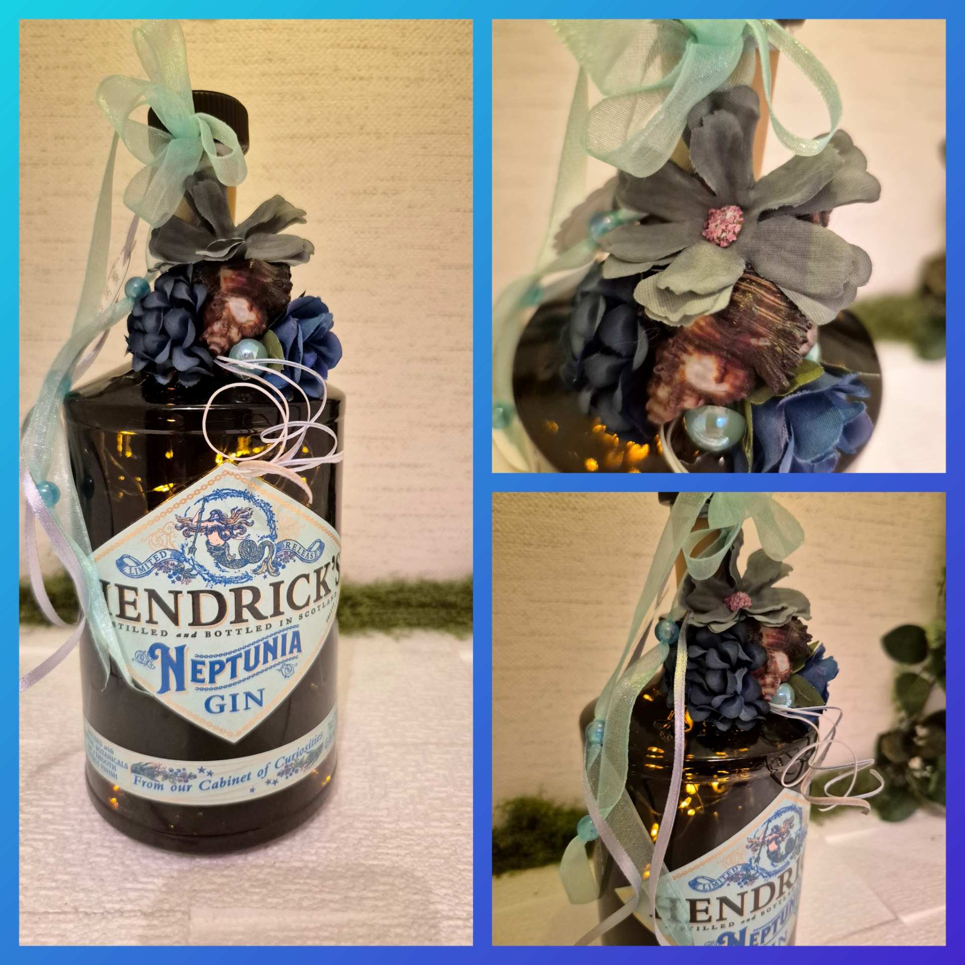 Meghitt dekoráció fénnyel. Tökéletes ajándék GIN-kedvelőknek, vagy bármely tér egyedi kiegészítője lehet. A ledfüzért elemmel biztosítom. Az üveget eredeti kereskedelmi formájában hagytam, hozzá illő dekorációval egészítettem ki, tengeri kagyló és egyéb hangulatos kiegészítők.