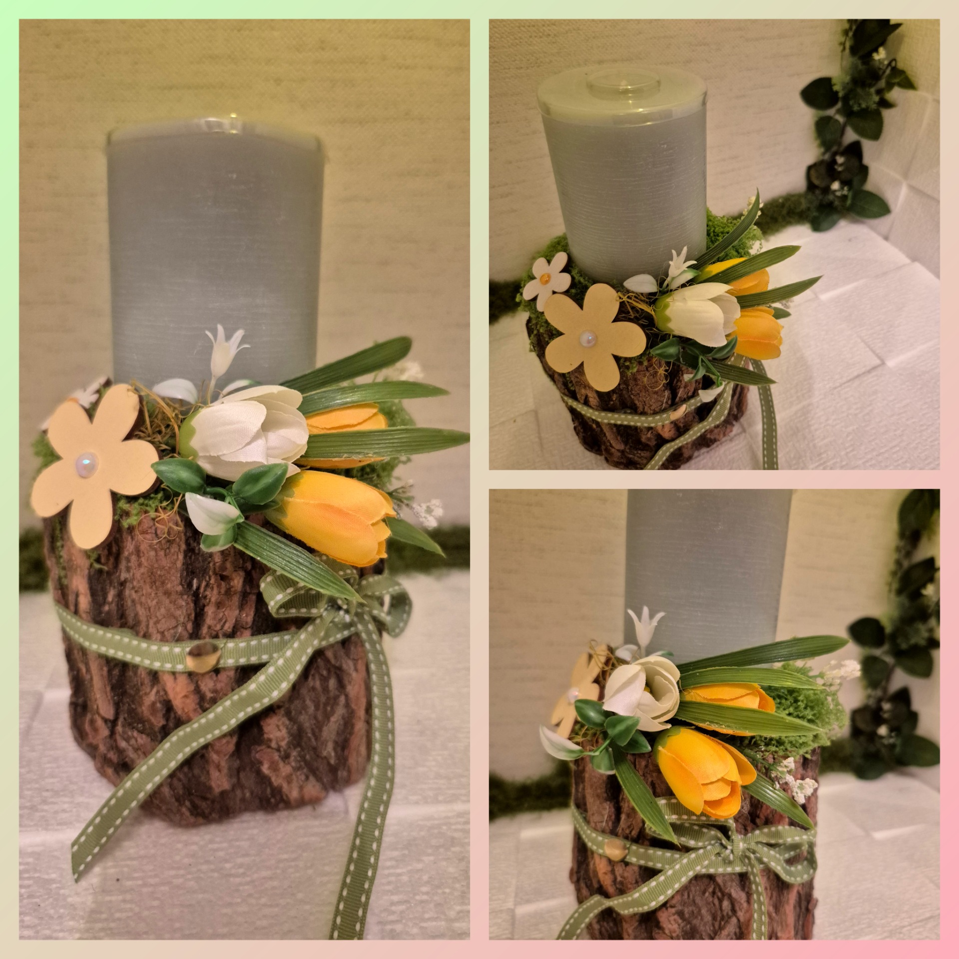 Természetes fa alapon, nagyméretű gyertyával és tavaszi hangulatot idéző kiegészítőkkel ékesített asztali kompozíció. A fa hengert akril lakkal kezeltem.