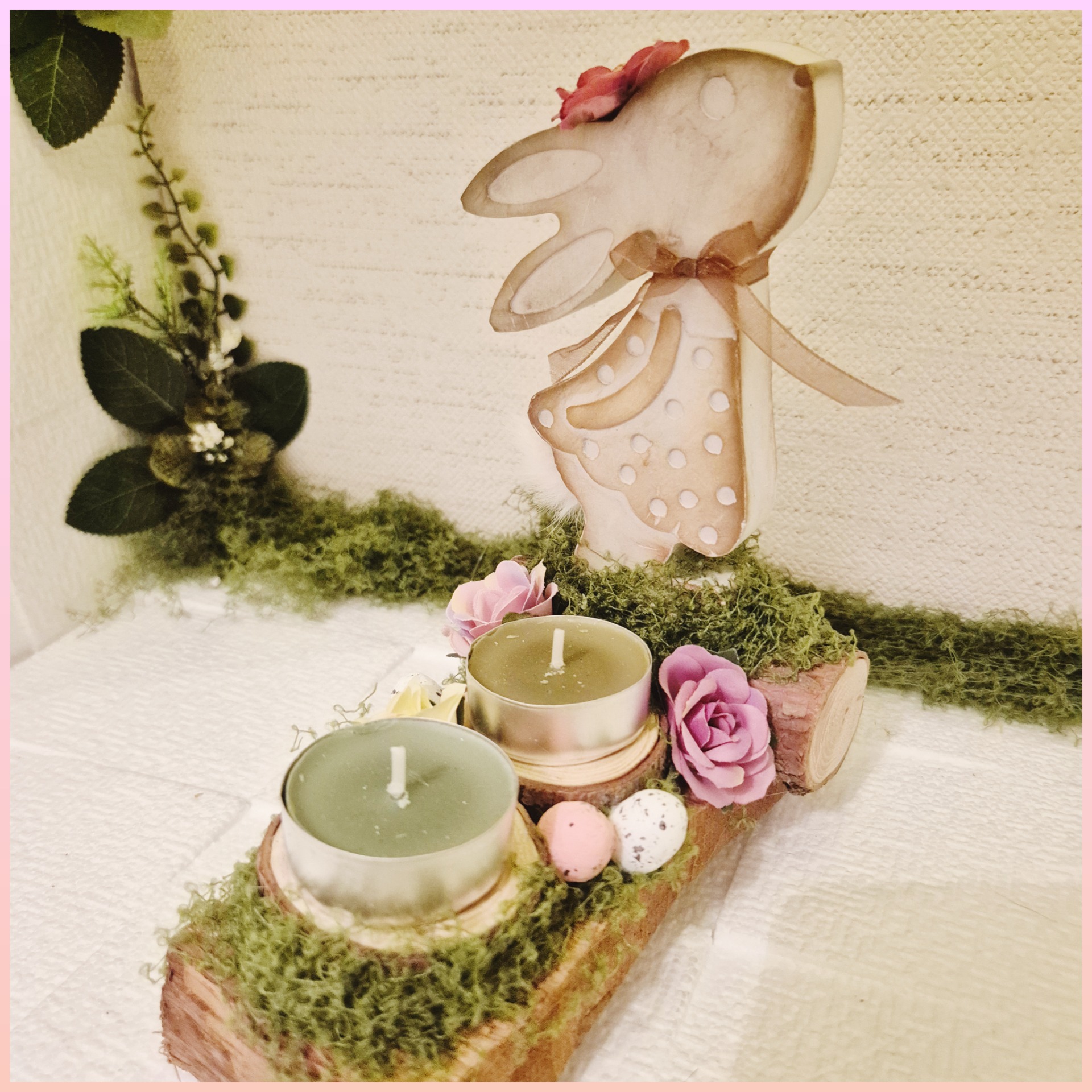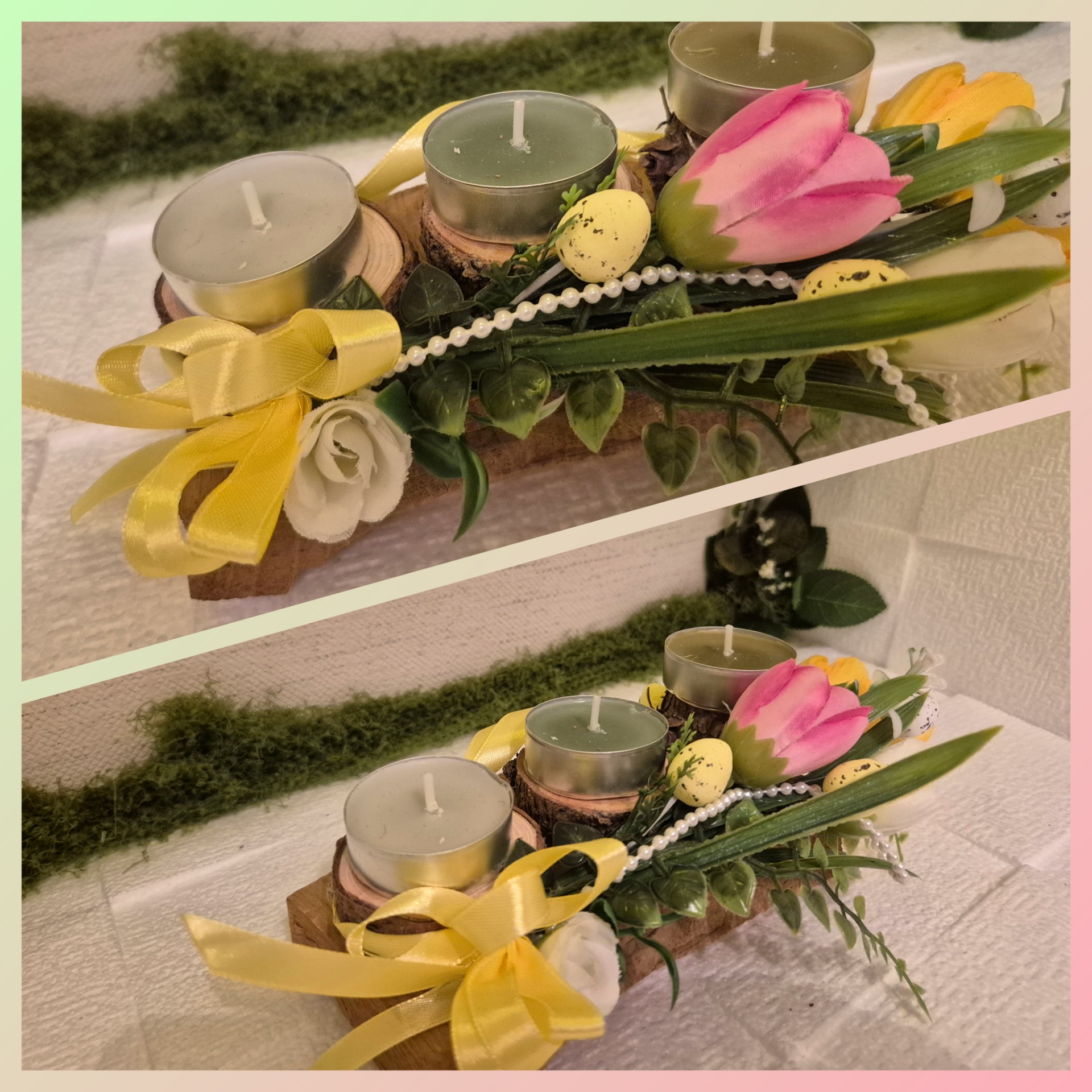 Természetes fa alapon, zöld árnyalatú teamécsesek, fa koronggal és tavaszias kiegészítőkkel. Kedves darab mely bármely térbe friss hangulatot hoz.