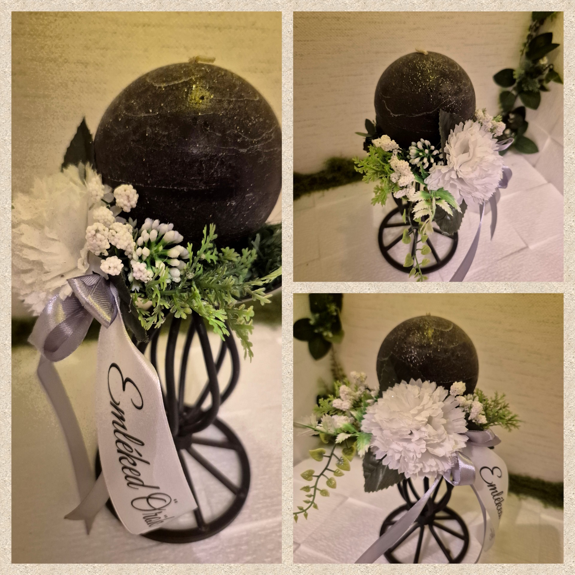 Rendkívül elegáns és bensőséges kompozíció fekete gömb gyertyával, mely végtelen tiszteletet áraszt. A fehér virágok méltó módon díszítik ezt a kegyeleti összeállítást.
