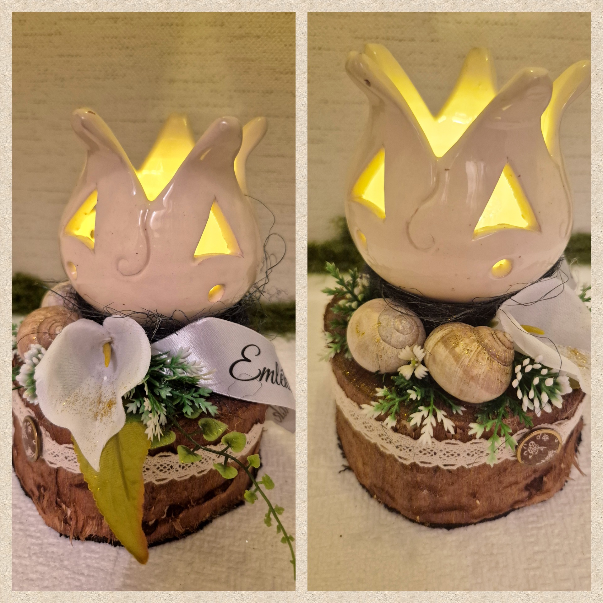 Természetes fa korong alapon, egyedi kerámiatulipán mécsestartóval készített kegyeleti sírdísz. A kála eleganciája, a vintage csipke és gomb szépsége, a csigaházak természetessége hozzájárul a harmonikus összképhez, amit ez a darab hordoz.