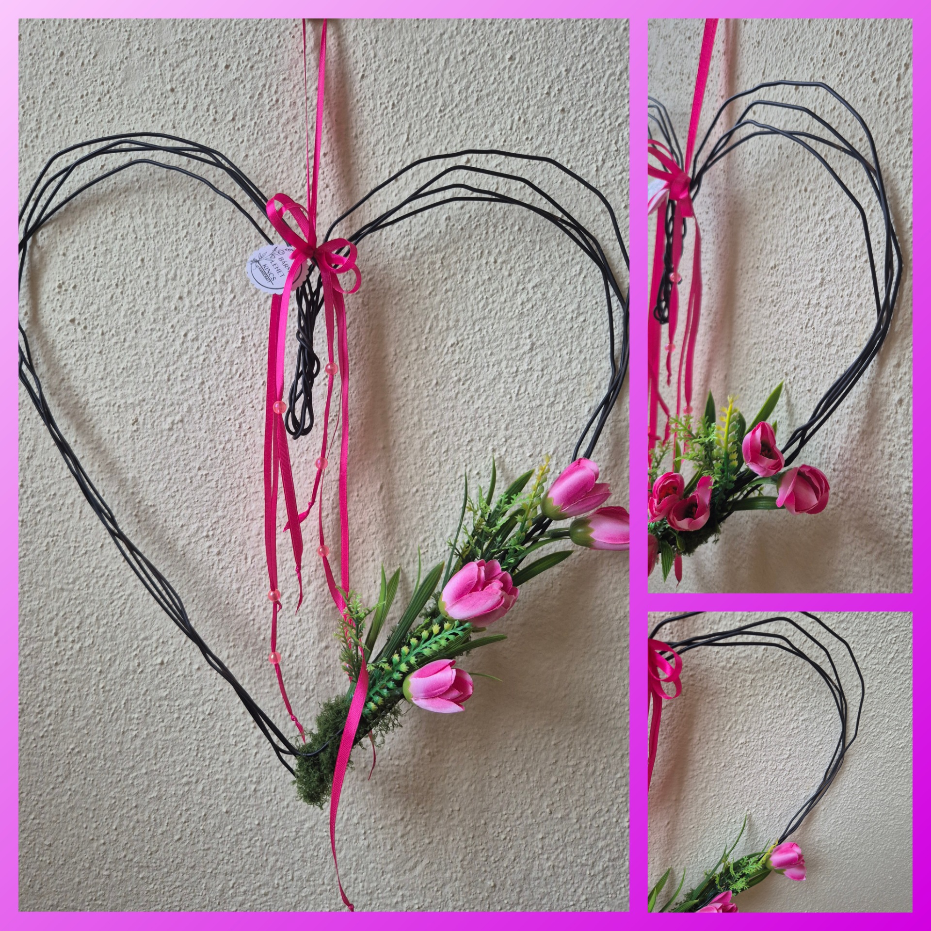 Letisztult, feketére alapozott hajlított fém szív, a tulipánok nemes egyszerűségével. Minimalista, mégis bájos függődísz.