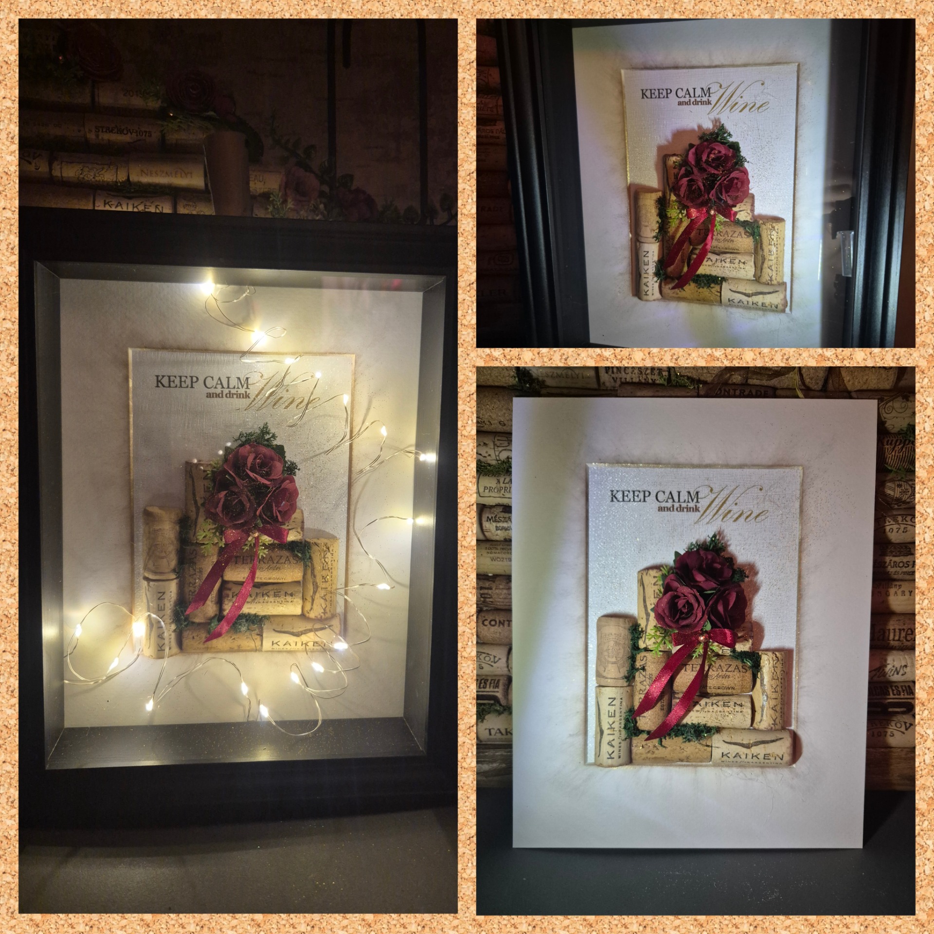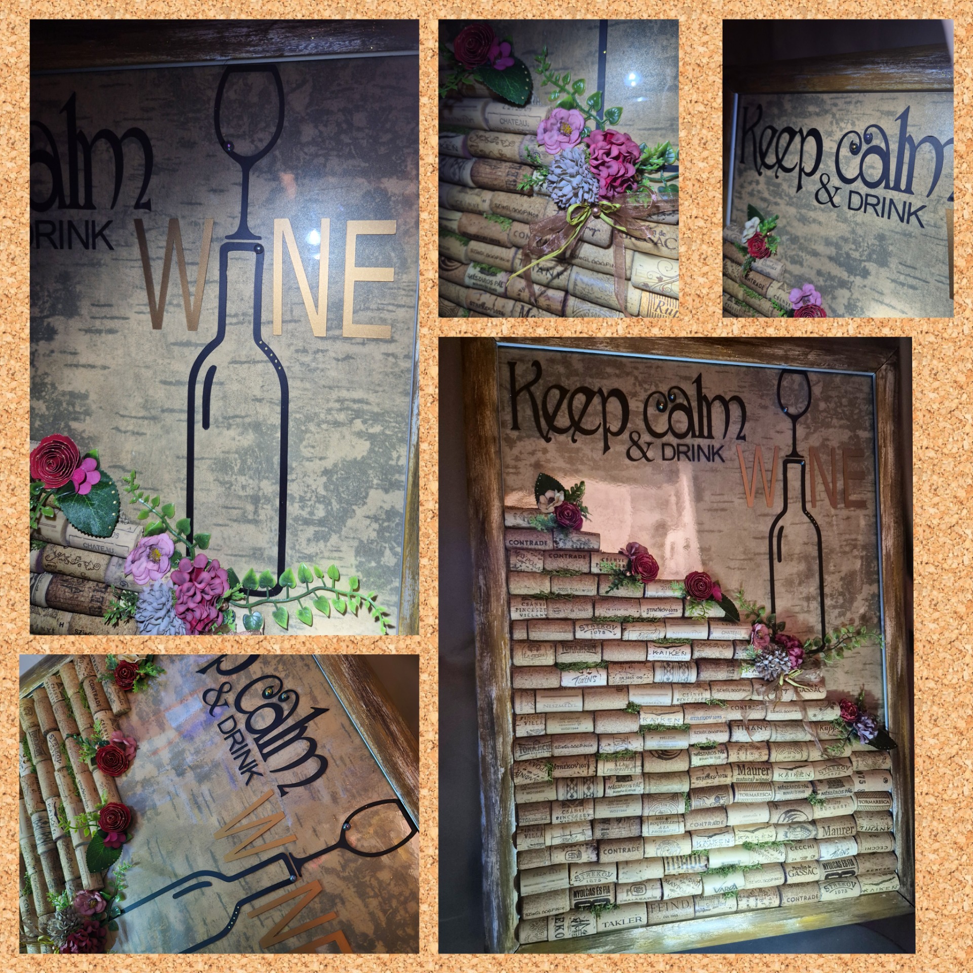 "Keep calm and drink wine" egyedi design plakátrendszerű képkerettel. Valódi parafadugókkal, a bor és az idő jegyeivel. A papír rózsák kézzel készültek, arany effektet kaptak. A keret akrillal festve, selyemfényű lakkal fújva. A felirat egyedi design. Különleges dísze lehet társasági tereknek, étkezőknek, otthonodnak, üzletednek, vagy ajándékba is adhatod borkedvelők részére. A rejtett rögzítési pont egyszerűen a click keret kinyitásával elérhető.