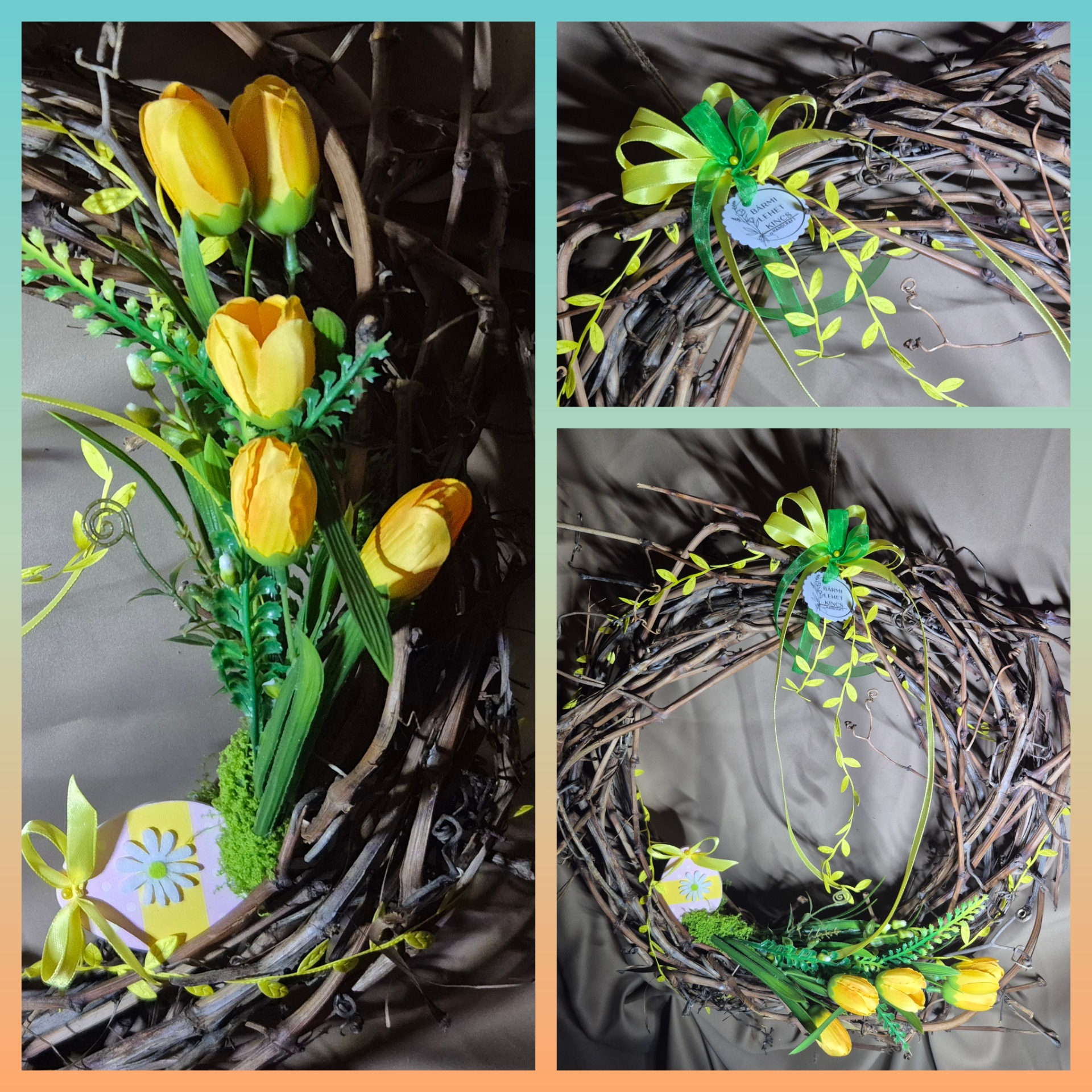 Meseszép, természetes szőlővessző koszorú tavaszi hangulatban. Letisztult, elbűvölő kompozíció.