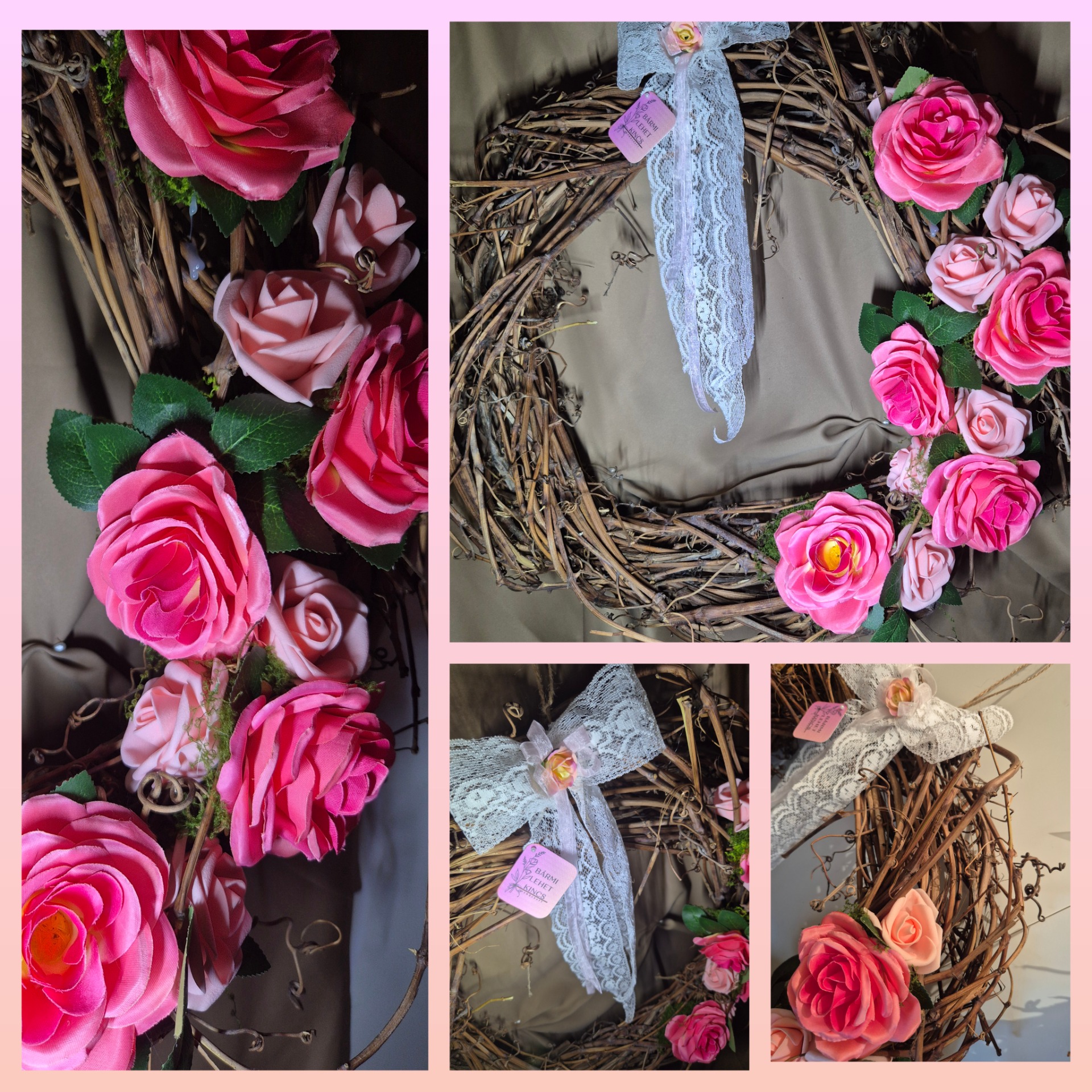Javíthatatlanul romantikus, nagyméretű függő koszorú, akár ajtóra/kapura/teraszra akasztható, vagy esküvői dekorációs elemként jelenhet meg, vagy bármely tér meseszép kiegészítője lehet.