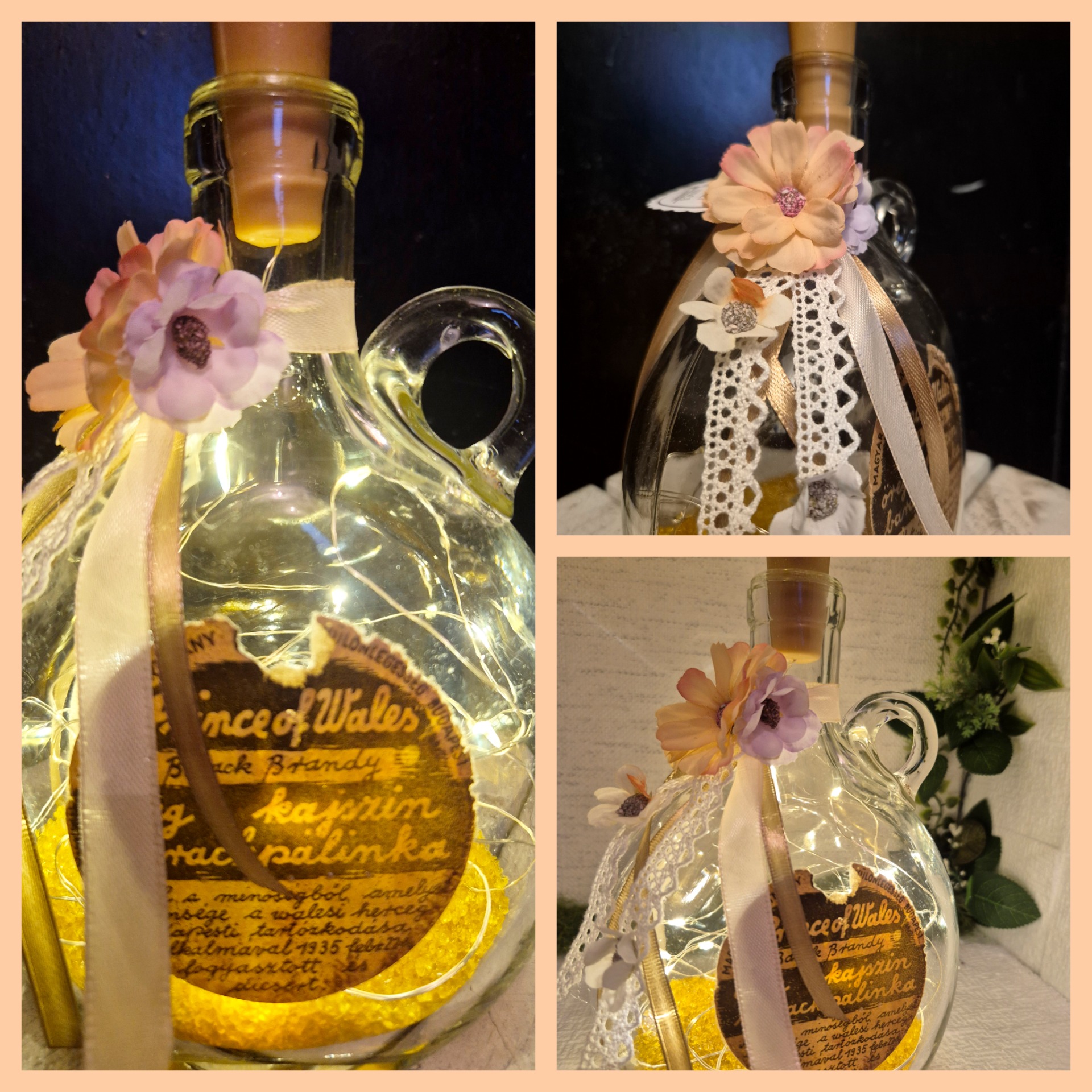 Meghitt dekoráció fénnyel. Tökletes ajándék pálinka-kedvelőknek, vagy bármely tér egyedi kiegészítője lehet. A ledfüzért elemmel biztosítom. A címke eredeti, kopottas állapotú. Gyűjteményből készült, egyedi darab. Töltet: aranyló dekorkristály.