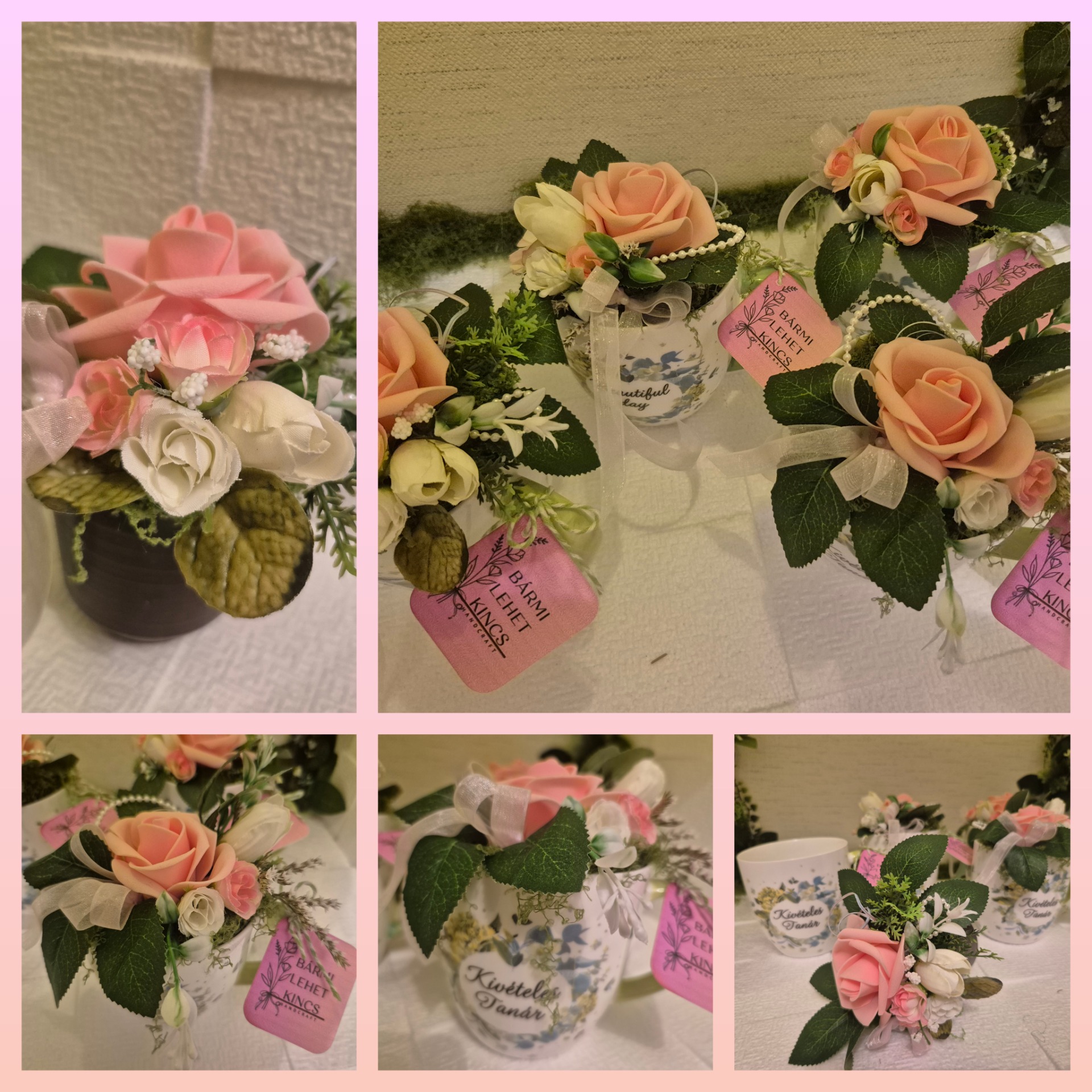 A bögréből a virágkompozíció kiemelhető, önálló dekorációs elem lehet, ha a bögrét a megajándékozott használni kívánja. Friss, elengáns, kedves köszönethordozó például pedagógus napra, vagy kollégáknak, édesanyáknak, barátnak, orvosnak