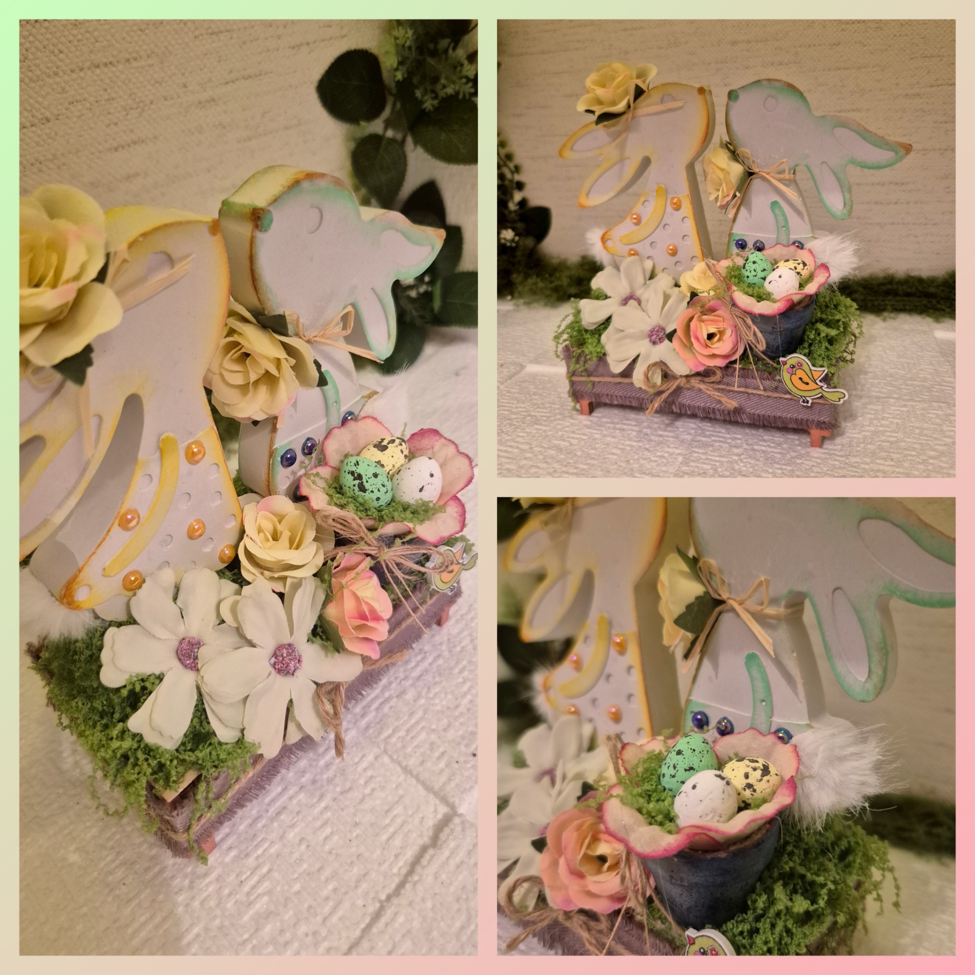 Természetes fa alapon, gipsz nyuszipár igazán színes, vidám húsvéti kompozícióban várja, hogy otthonod dísze lehessen.
