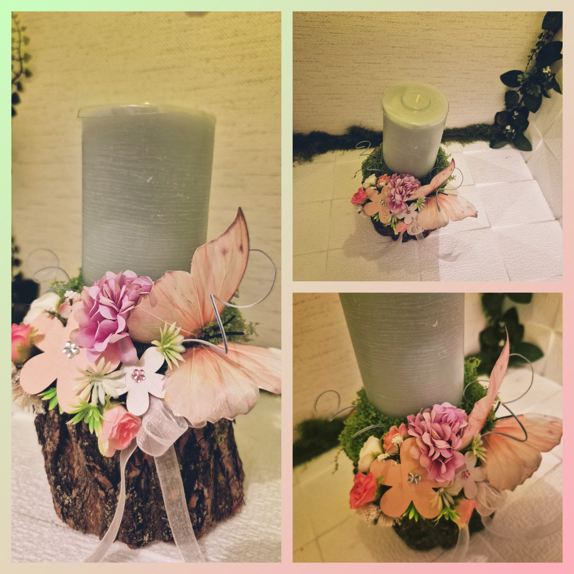 Természetes fa alapon, nagyméretű gyertyával, pillangóval és tavaszi hangulatot idéző kiegészítőkkel ékesített asztali kompozíció. A fa hengert akril lakkal kezeltem.