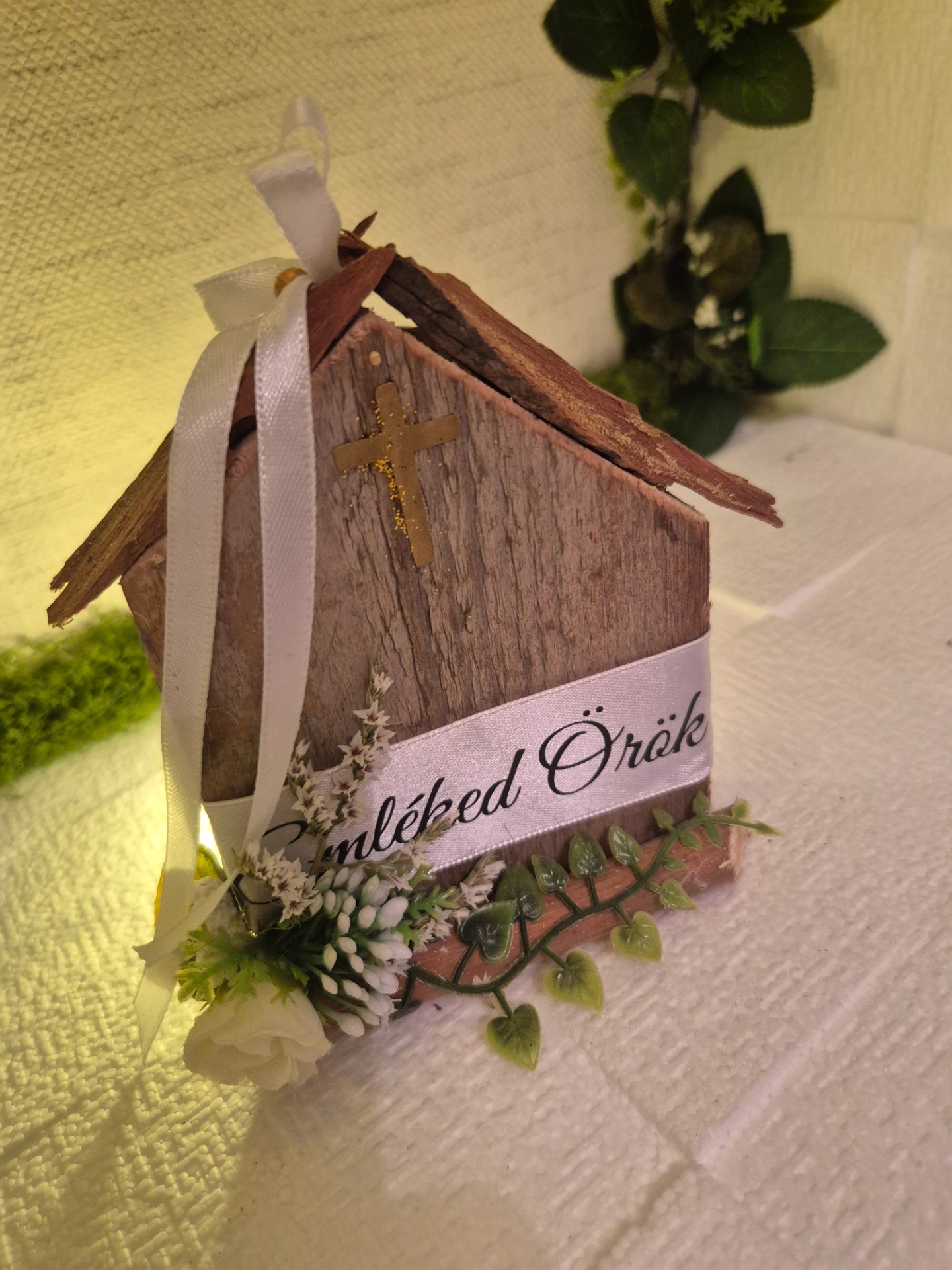Ez a sírdísz rendkívül egyszerű, mégis sok mindent tud képviselni. Alapja egy régi fa, mely viseli az idő nyomait és szabálytalan házikó formát öltött, teteje szintúgy. Apró aranyszínű kereszt, szalag és pici virág díszíti.