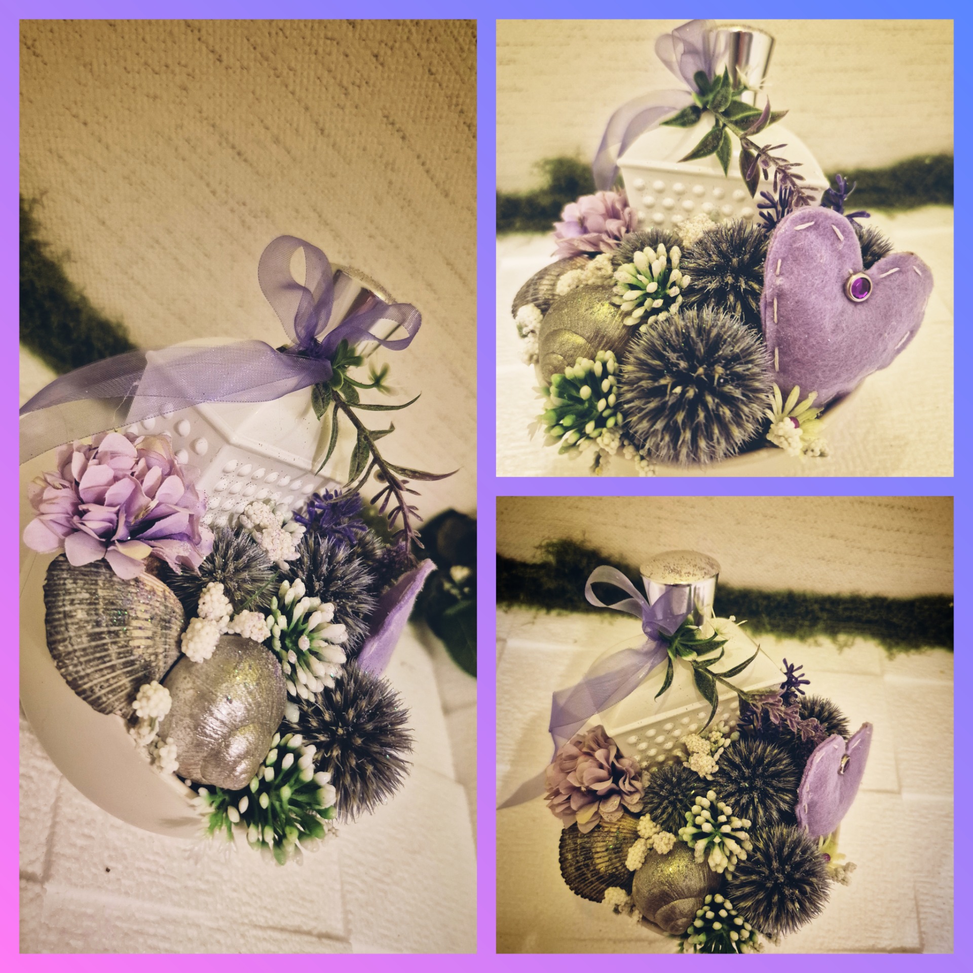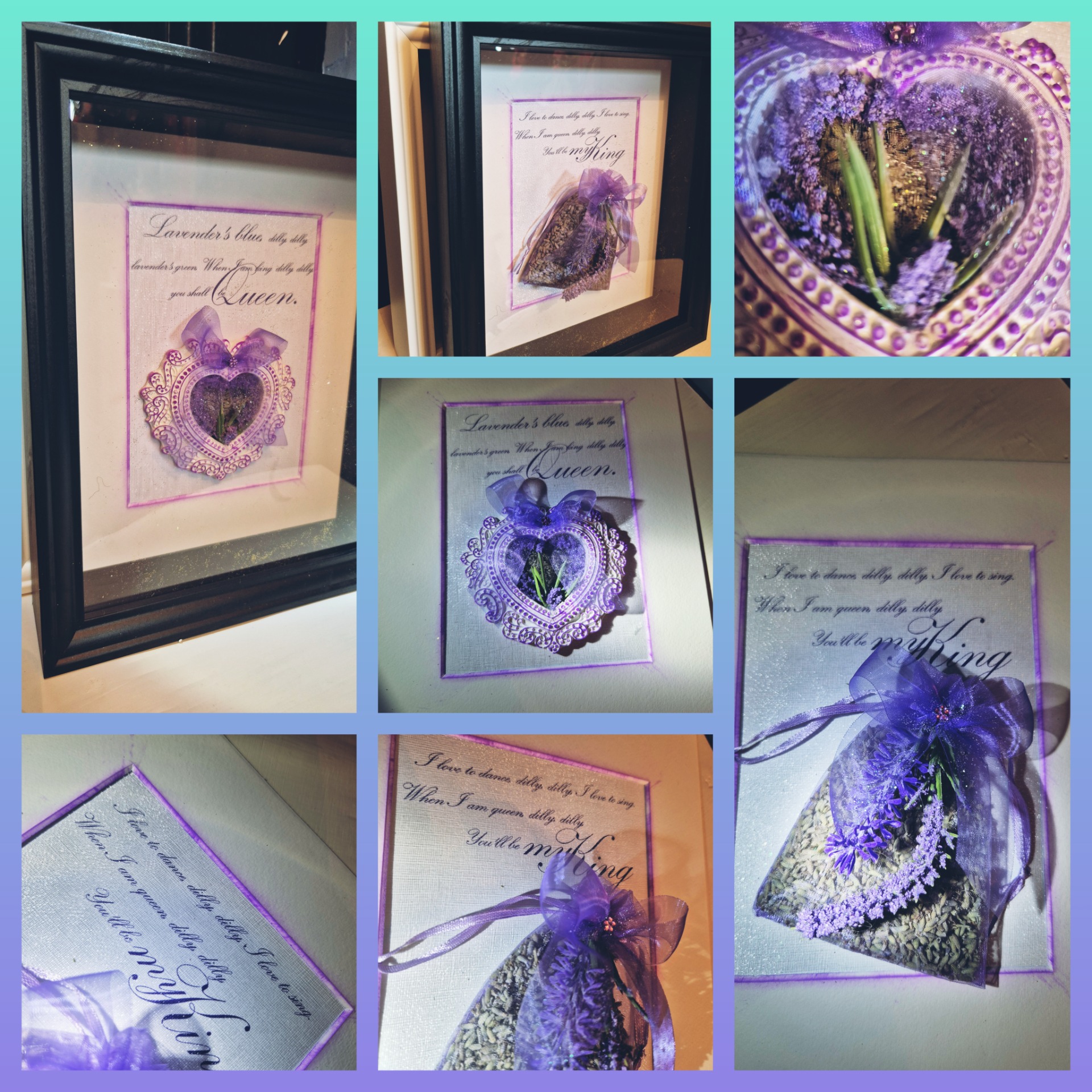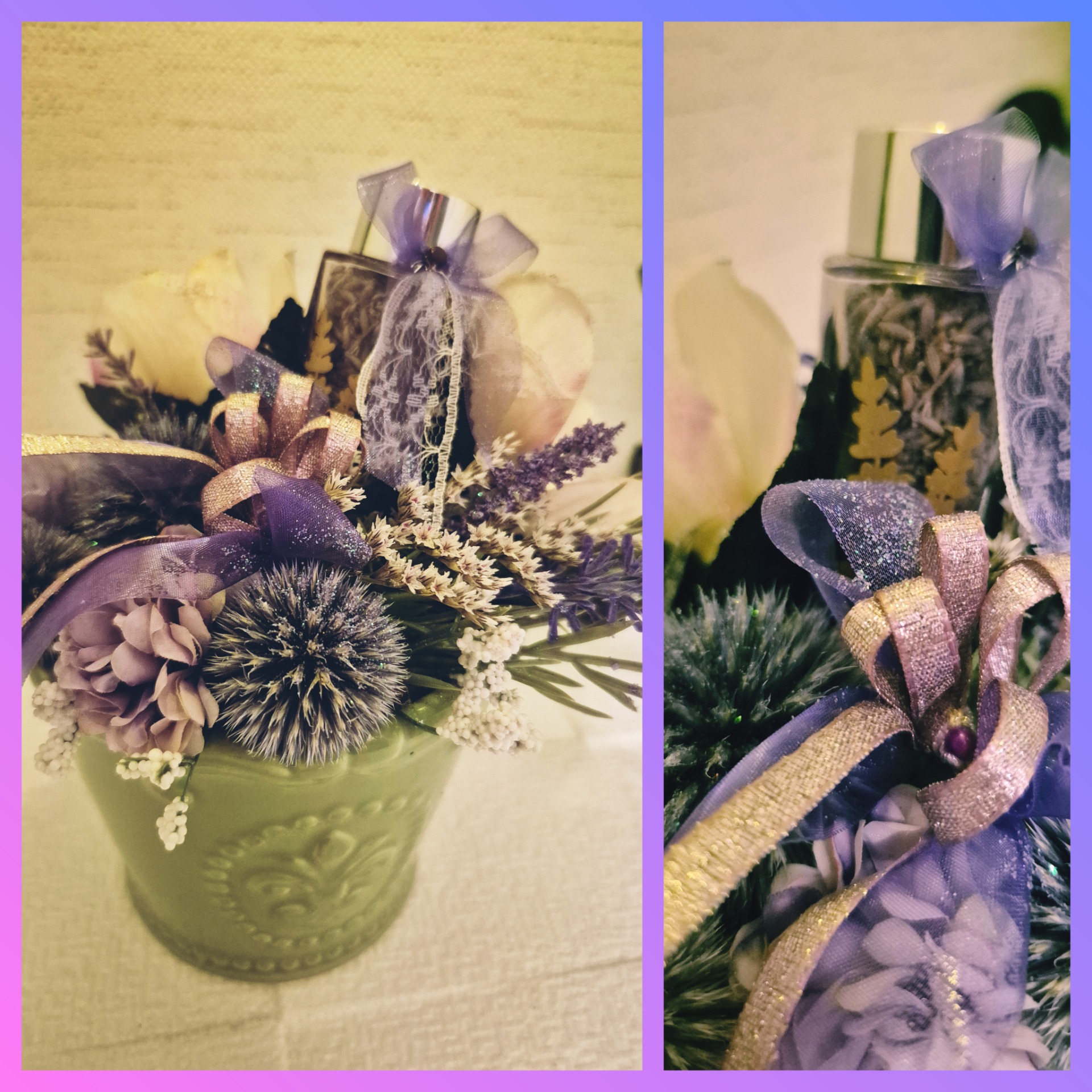 Egyiken részletgazdag gipsz keretben, másikon lila organza tasakban általam szárított levendula van.
