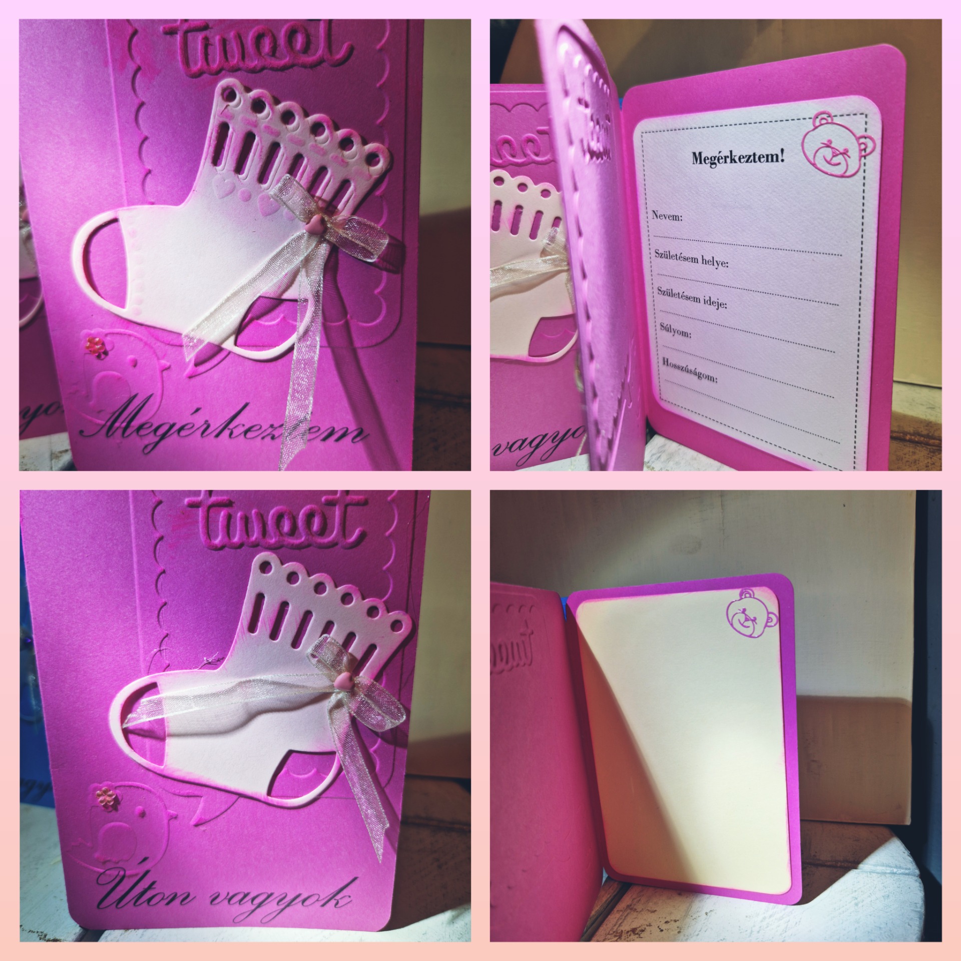 Mondd el így szeretteidnek a jó hírt! Egy új családtag érkezése hatalmas áldás, s ezzel a kísérővel maradandóan megoszthatod kislányod érkezését/világra jöttét a számodra fontosakkal. Ez a lap arra bátorít, hogy írj bele, amit csak szeretnél! Így válik sokkal személyesebbé, bensőségesebbé az üzenet. (Neeem, nem írsz csúnyán :) Ultrahang/újszülött is ragaszthatsz bele. (javasolt: kétoldalú ragasztóval)