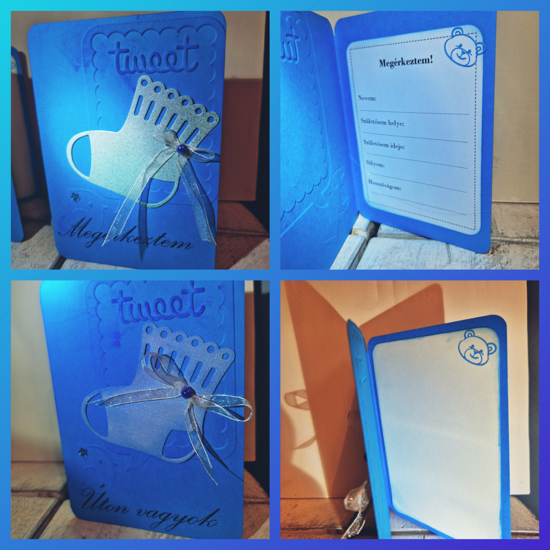 Mondd el így szeretteidnek a jó hírt! Egy új családtag érkezése hatalmas áldás, s ezzel a kísérővel maradandóan megoszthatod kisfiad érkezését/világra jöttét a számodra fontosakkal. Ez a lap arra bátorít, hogy írj bele, amit csak szeretnél! Így válik sokkal személyesebbé, bensőségesebbé az üzenet. (Neeem, nem írsz csúnyán :) Ultrahang/újszülött képet is ragaszthatsz bele. (javasolt: kétoldalú ragasztóval)